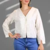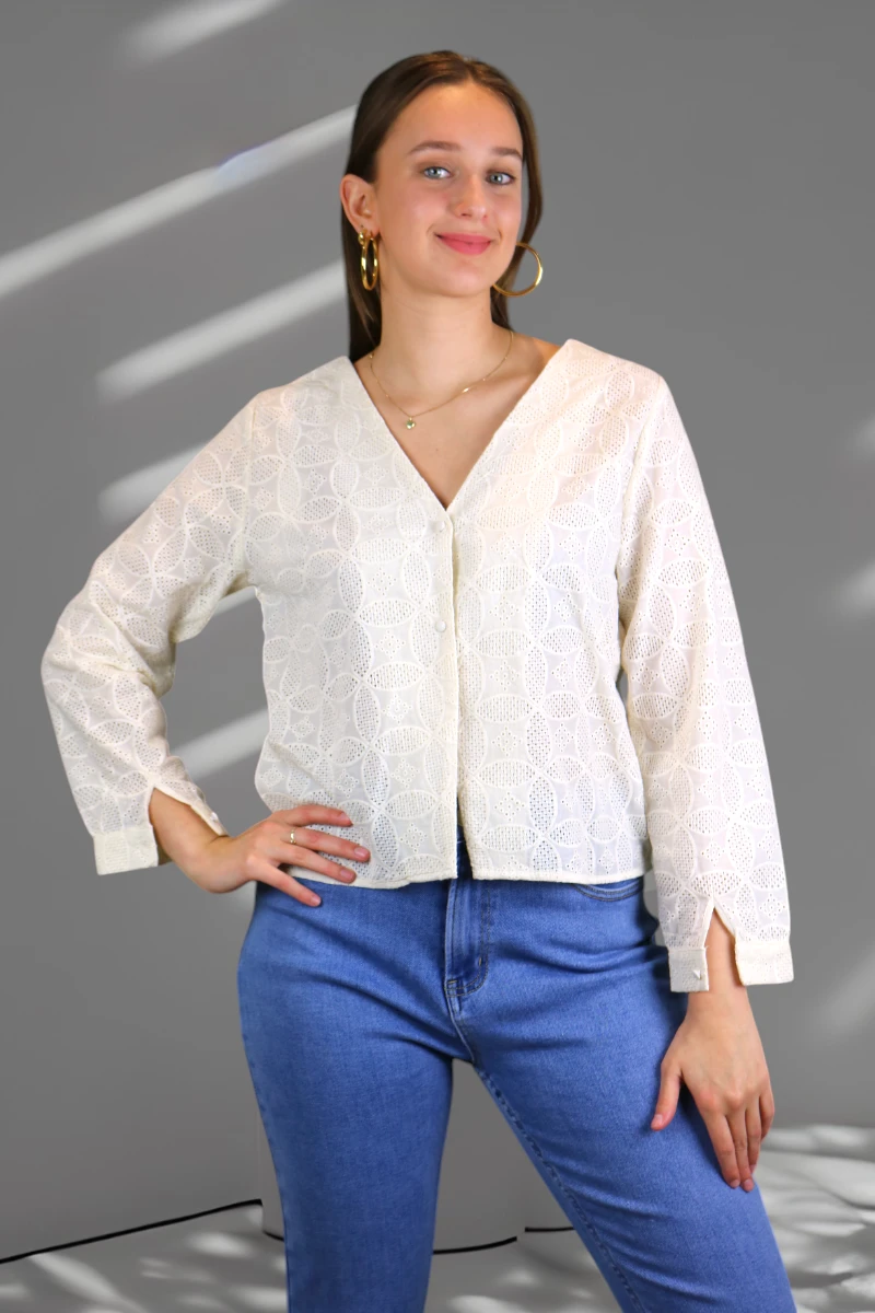 Geef je garderobe een upgrade met deze veelzijdige ecru broderie blouse! ✨ Het bijzondere? Je draagt ‘m zowel voor als achter – twee stijlen in één! Voor een verfijnde look kies je de ronde hals aan de voorkant, of draai hem om voor een elegante V-hals aan de rug. Het ingeweven geometrische patroon geeft deze blouse een luxe uitstraling die elke outfit bijzonder maakt. De speelse pofmouwen en de sierlijke knoopjes zorgen voor verschillende mogelijkheden – perfect van kantoor tot avondeten! Combineer hem met je favoriete spijkerbroek voor een moeiteloos elegante uitstraling. Floor is 1.76m en draagt maat M