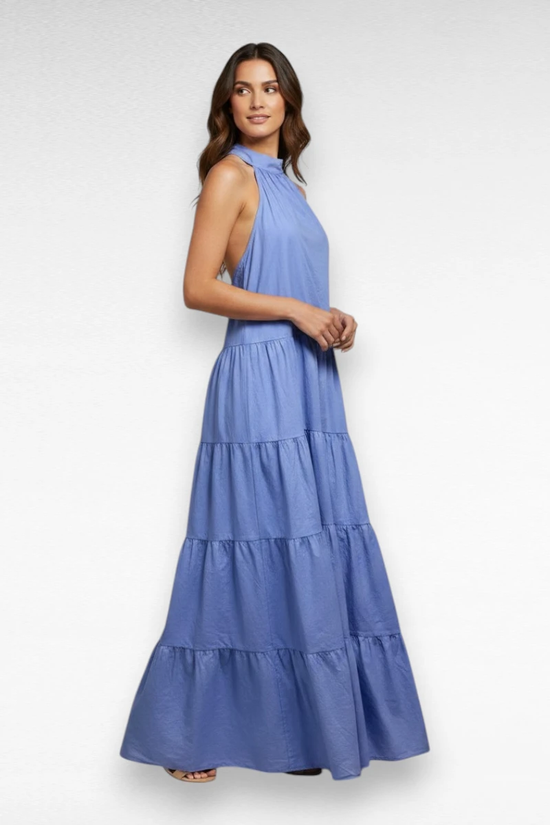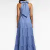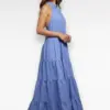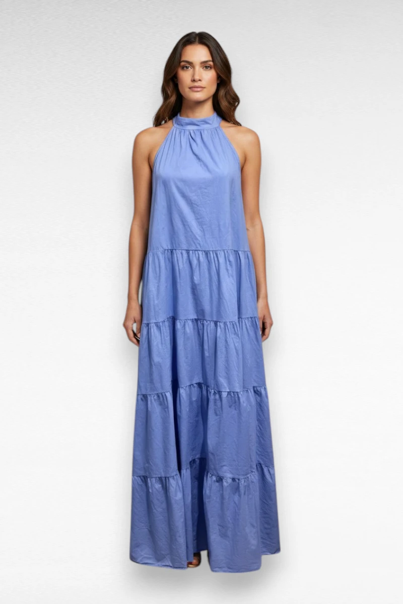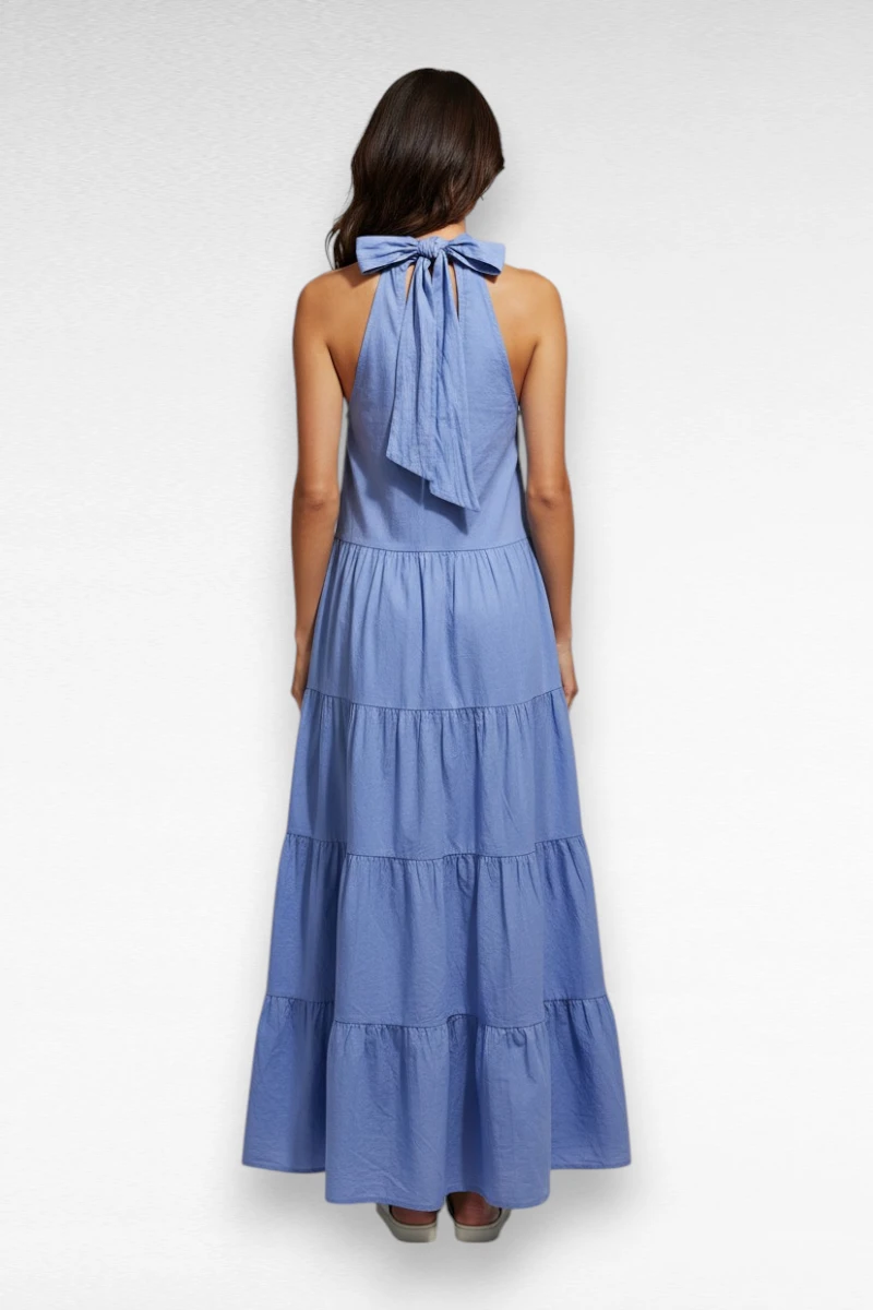 Deze prachtige blauwe maxi jurk is een echte must-have voor het voorjaar en de zomer. De jurk heeft een elegante halterhals met striksluiting aan de achterkant, wat zorgt voor een vrouwelijke en verfijnde uitstraling. Het mouwloze model en de luchtige stof maken deze jurk heerlijk comfortabel op warme dagen.