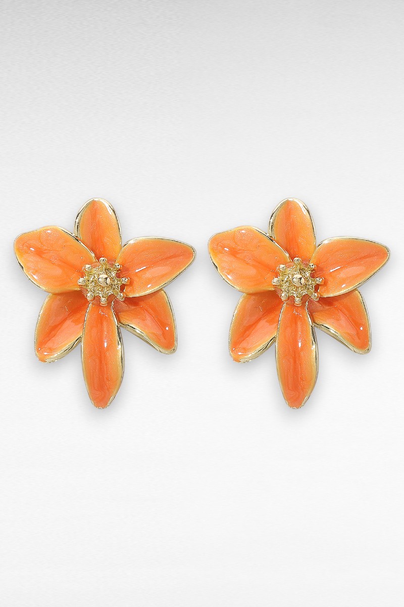 Laat je look stralen met deze oranje bloemoorbellen – dé perfecte combinatie van kleur, elegantie en flair! De oorbellen hebben een prachtig bloemdesign met oranje blaadjes en gouden accenten in het midden, wat zorgt voor een chique en speelse uitstraling.