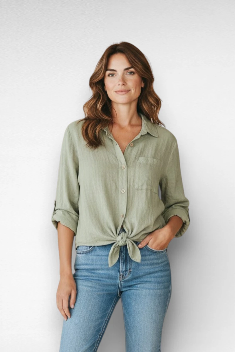De luchtige linnen stof zorgt voor een comfortabele pasvorm en maakt deze blouse ideaal voor warmere dagen. Draag hem los, stop hem in je broek of knoop hem aan de voorkant voor een trendy en ontspannen look.