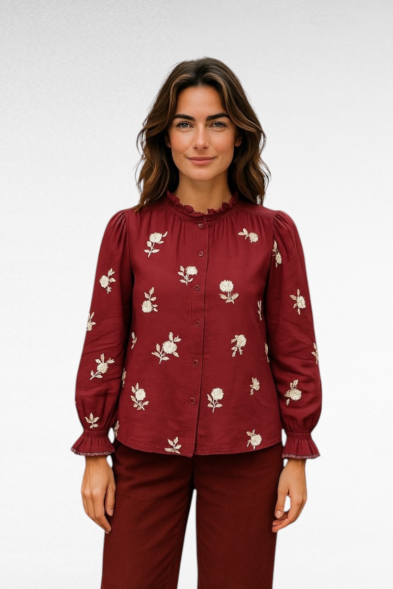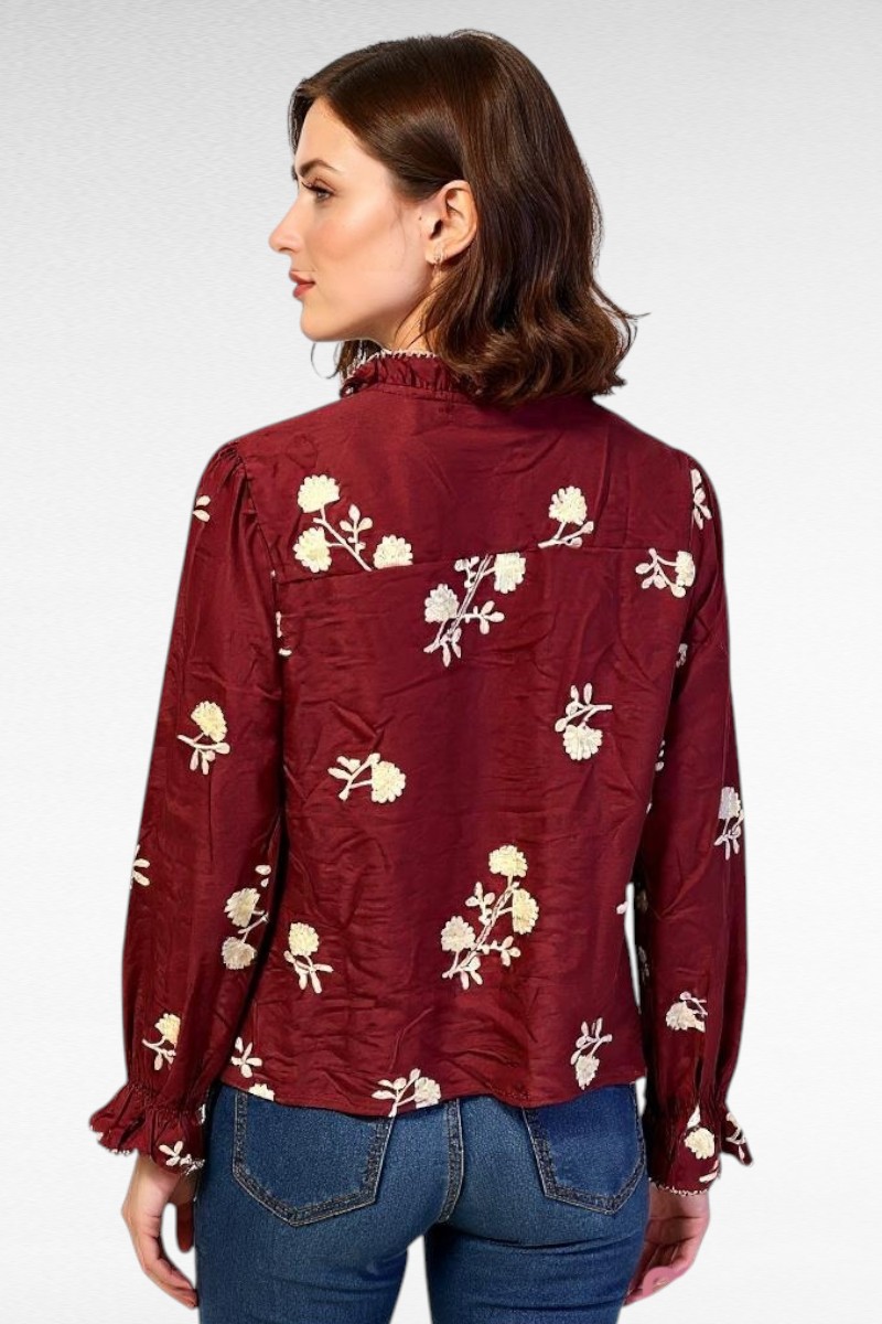 Voel je fantastisch in deze prachtige donker rode blouse met bloemen . Perfect voor elke gelegenheid!