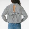 Deze stijlvolle blauw-wit gestreepte blouse is een echte eyecatcher dankzij de prachtige strik op de rug. De open rug met strikdetail geeft een vrouwelijke en speelse uitstraling, terwijl de klassieke strepen zorgen voor een tijdloze look. De blouse heeft een losse, comfortabele fit en valt soepel om het lichaam. Perfect om zowel casual te dragen op een jeans als chic te combineren met een pantalon.