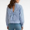 Deze stijlvolle blauw-wit gestreepte blouse is een echte eyecatcher dankzij de prachtige strik op de rug. De open rug met strikdetail geeft een vrouwelijke en speelse uitstraling, terwijl de klassieke strepen zorgen voor een tijdloze look. De blouse heeft een losse, comfortabele fit en valt soepel om het lichaam. Perfect om zowel casual te dragen op een jeans als chic te combineren met een pantalon.