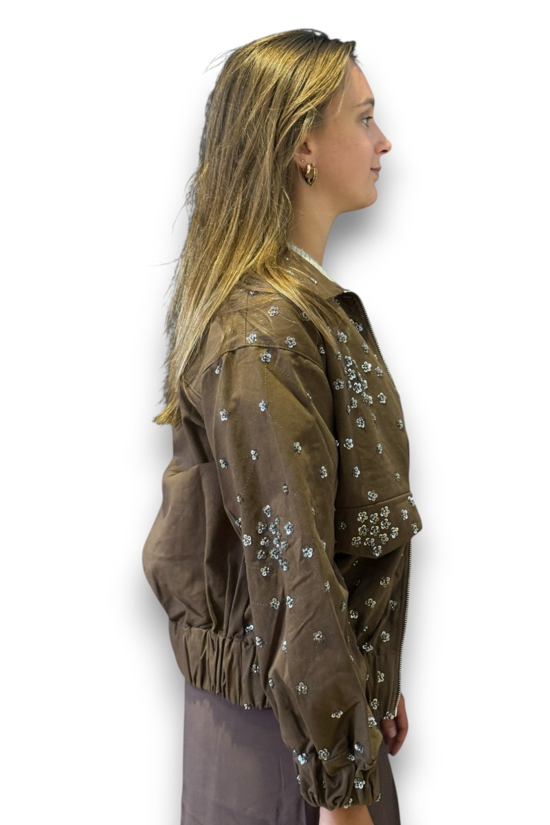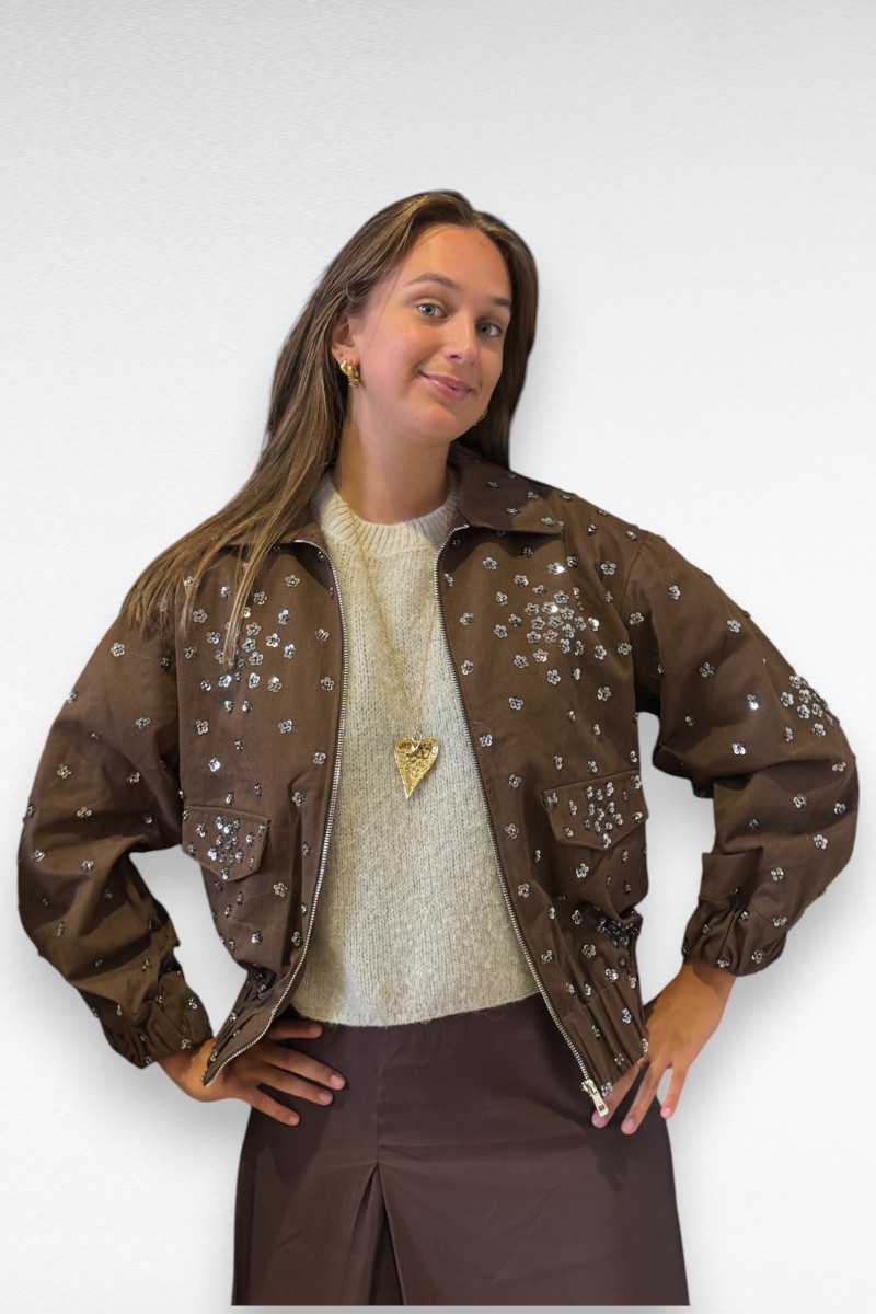 Shine bright met dit bruine glitter jasje! 🤎✨ Dit jasje is dé perfecte mix van stoer en girly. De kleine glittersteentjes geven een sprankelende touch, terwijl de relaxte fit en stoere rits zorgen voor een casual vibe.