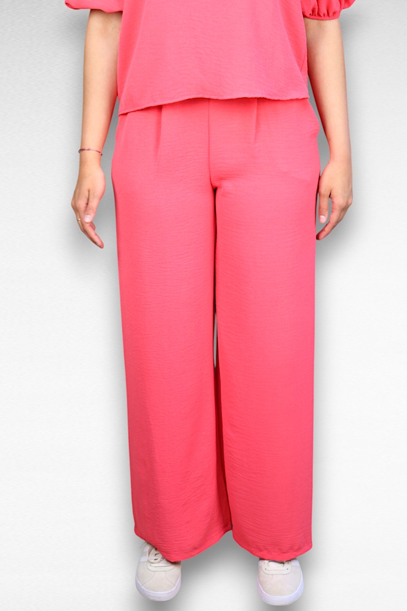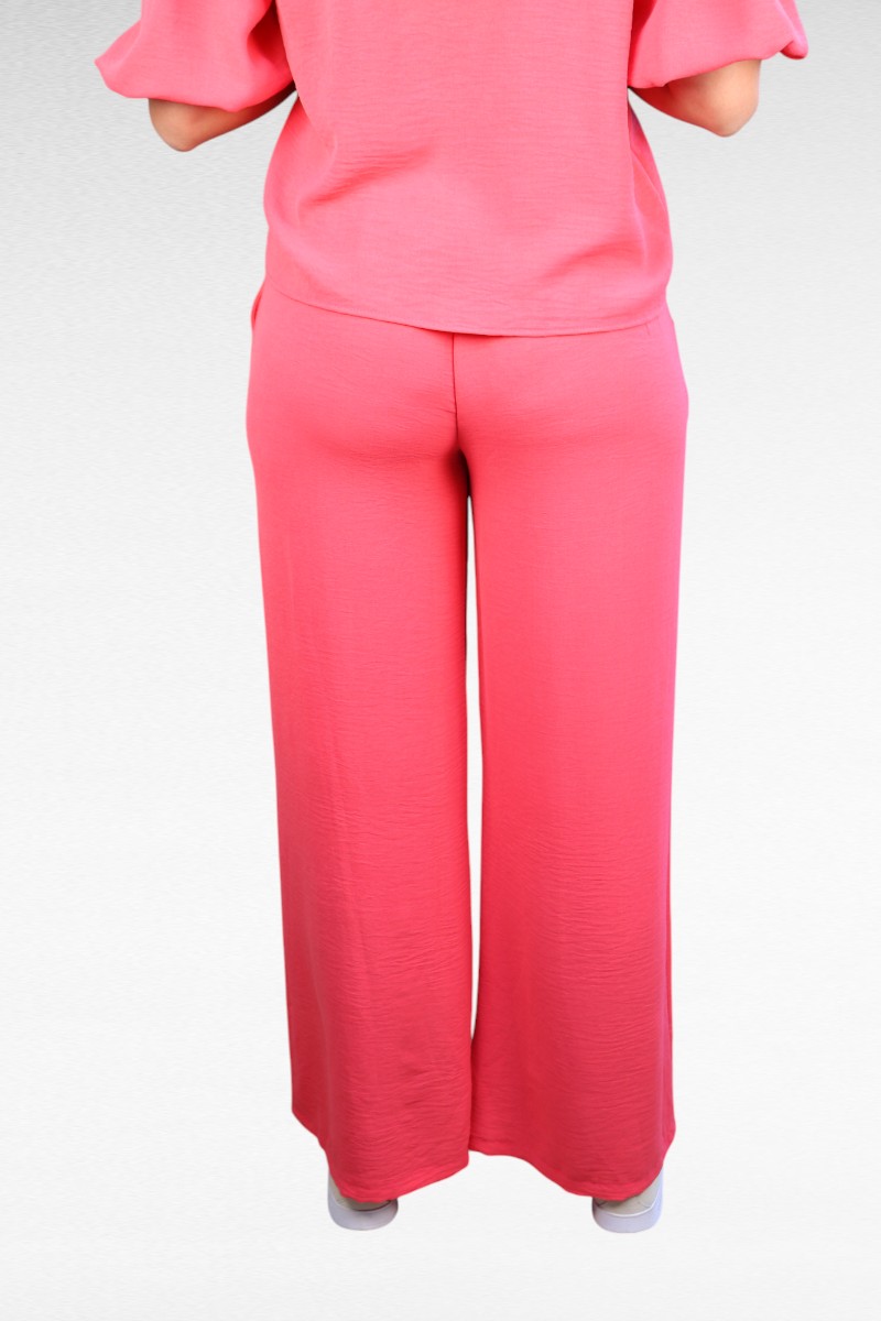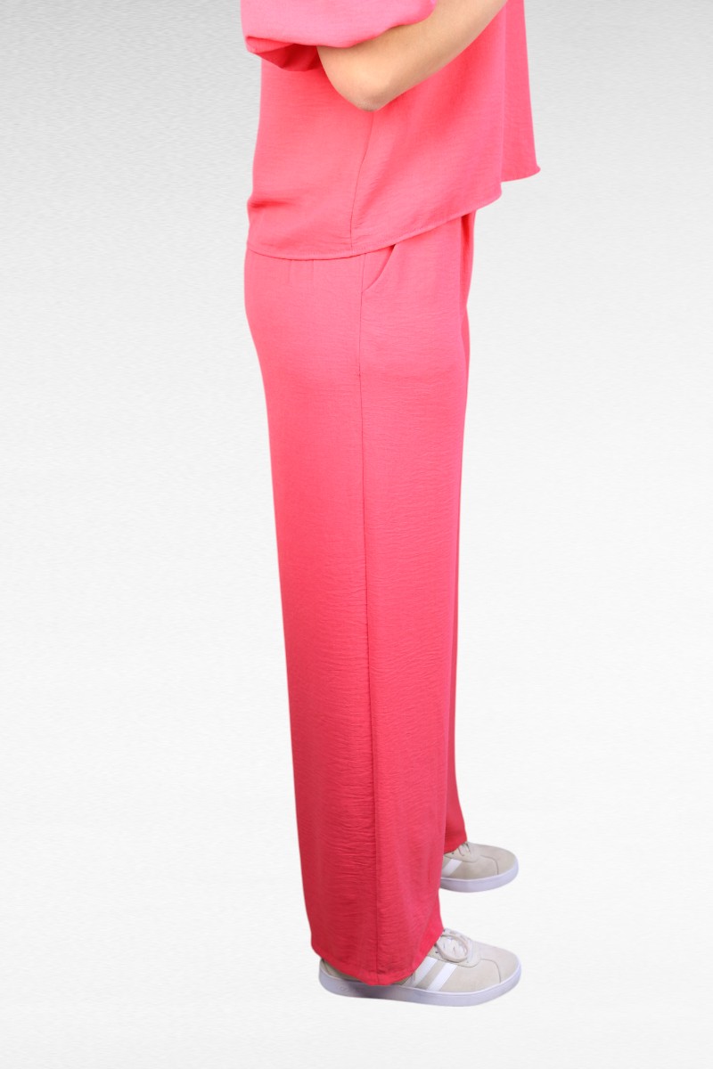 Deze comfortabele roze wijde broek is jouw nieuwe favoriet voor zowel relaxdagen als stijlvolle uitjes! De hoge taille en wijde pijpen geven een trendy silhouet dat voor iedereen flatteert. Met de elastische tailleband zit je de hele dag comfortabel en de handige zakken maken hem praktisch voor dagelijks gebruik. Het zachte, luchtige materiaal valt soepel om je benen en beweegt mooi mee. Combineer met de matchende top voor een complete look of met een basic shirt voor een casual outfit. Deze broek is perfect voor warme dagen en geeft je outfit direct een zomerse vibe!