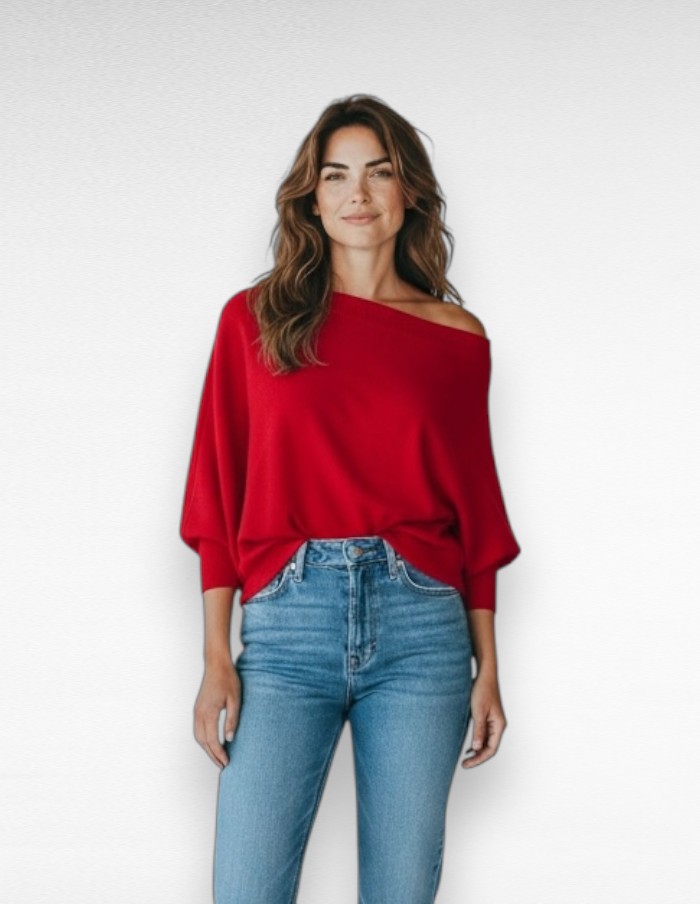 Fijn gebreide knal rode damestrui met vlindermouw.