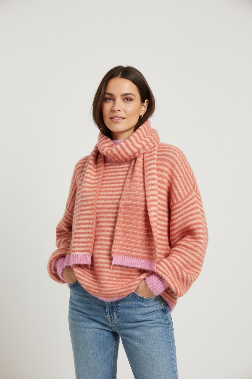 Warm, stijlvol en heerlijk cosy — deze ruim vallende knit sweater met bijpassende sjaal is hét item dat je deze winter niet wilt missen. De zachte roze tinten met subtiele streep zorgen voor een frisse, vrouwelijke look die perfect past bij moderne dames die houden van comfort én stijl.