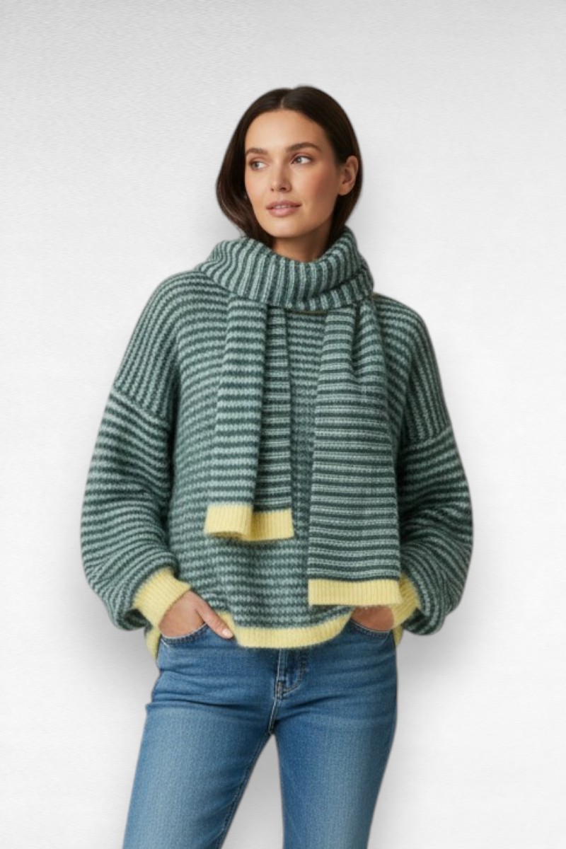Deze cosy gestreepte knit sweater met bijpassende sjaal is een absolute musthave voor het najaar en de winter. De zachte blue/green tinten in combinatie met de subtiele lichtgele accenten creëren een frisse, moderne look die perfect past bij dames die houden van comfort én stijl.