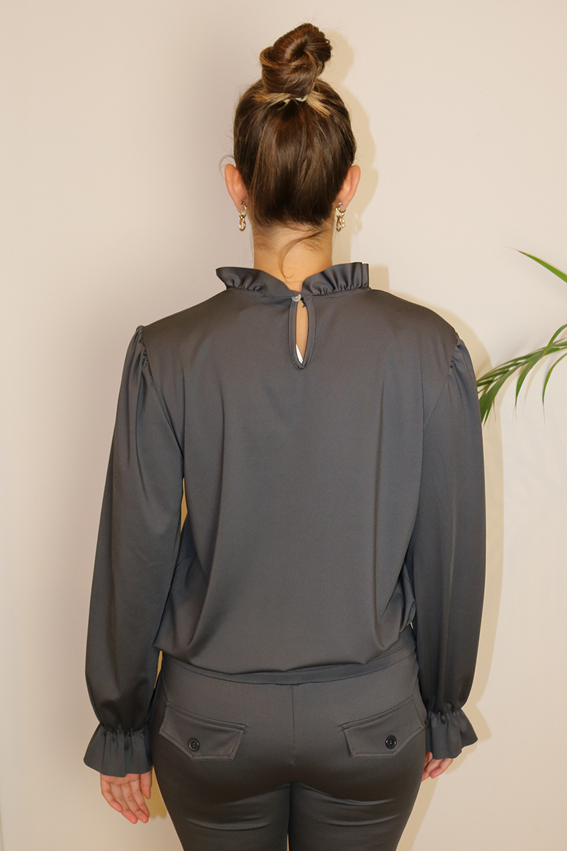 Antraciet grijze dames blouse van dunne travel kwaliteit. Deze mooie blouse heeft een hoge hals met opstaande boord en lange mouw die aan het uiteinde uitlopen en een elastische band hebben. Een wat losser model met een pof schouder. Een super zachte stof die heerlijk soepel draagt. In combinatie met de bijpassende travel broek heb je een mooie basis set die je kunt aanvullen met een Gilet, Vestje of Colbert. Ons model draagt maat M en is 1.76m.