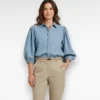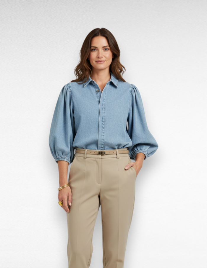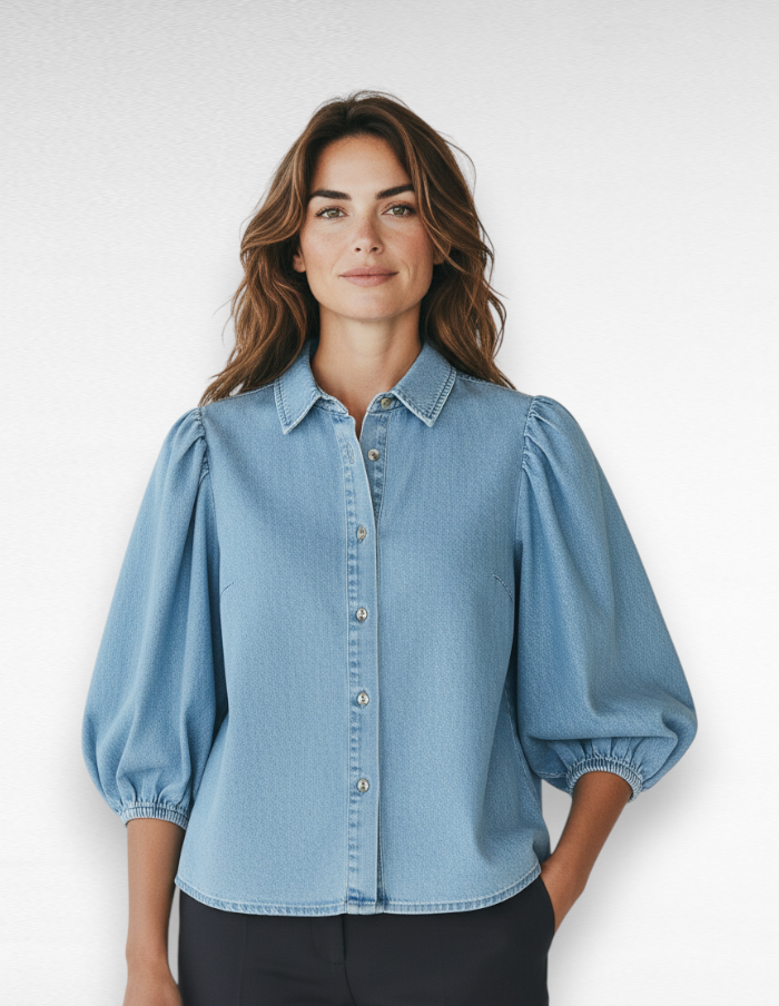Licht blauwe jeans blouse met 3/4 pof mouw.