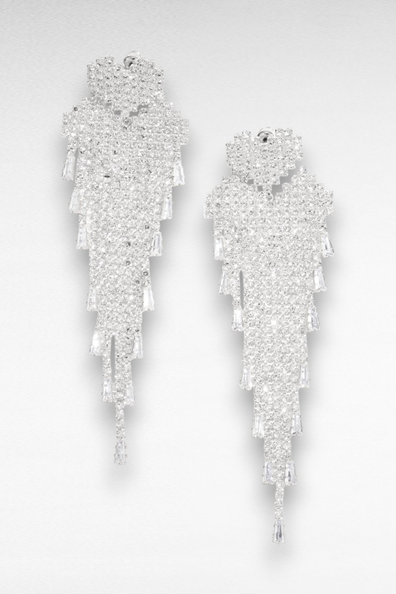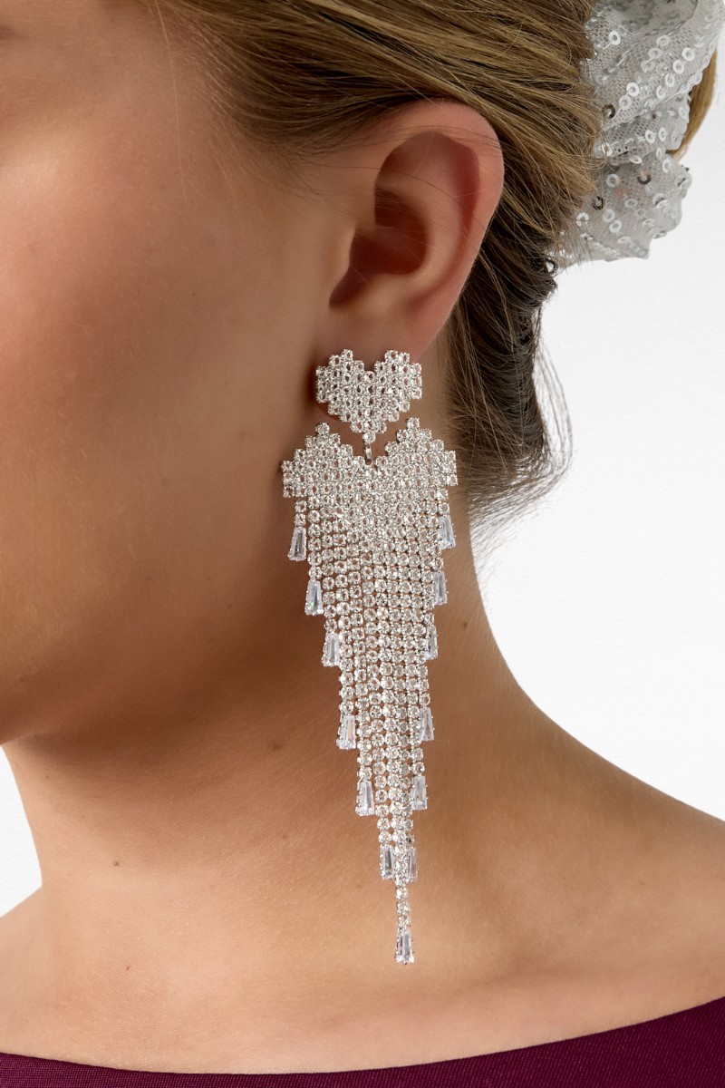 Deze zilveren statement oorbellen zijn een echte eyecatcher. Het verfijnde hartvormige detail aan de bovenzijde loopt over in een elegante, lange cascade van fonkelende strass steentjes. De oorbellen vangen het licht bij elke beweging en geven je outfit direct een luxe en feestelijke uitstraling.