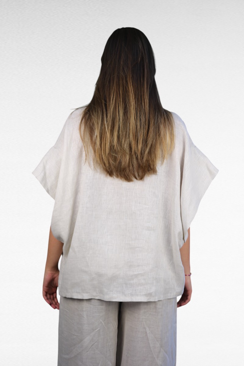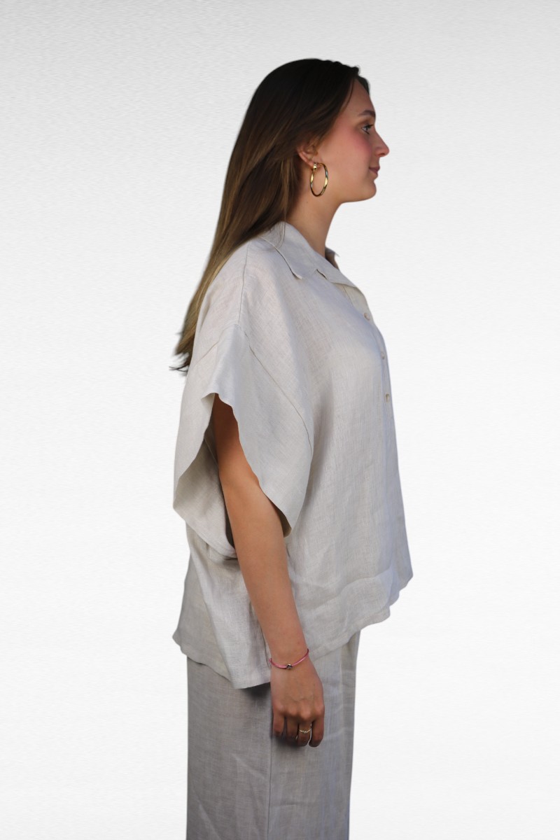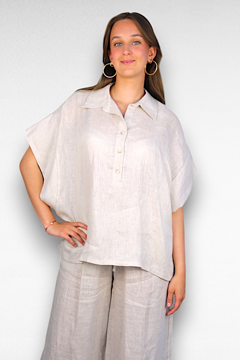 De klassieke kraag met knoopsluiting zorgt voor een nette touch, terwijl de wijde mouwen zorgen voor een nonchalante flair. Combineer ‘m met de bijpassende linnen broek of style ‘m losjes over je bikini: alles kan, alles mag 🌞