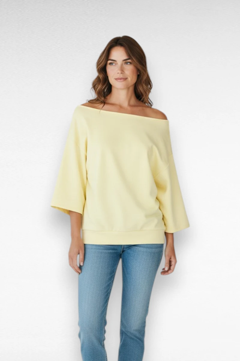 Deze lichtgele top is een frisse en vrouwelijke basic met een elegante uitstraling. Het off-shoulder model zorgt voor een subtiele, zomerse look, terwijl de wijde mouwen een luchtig en comfortabel gevoel geven. De gerafelde randjes geven de top een speels en nonchalant detail.