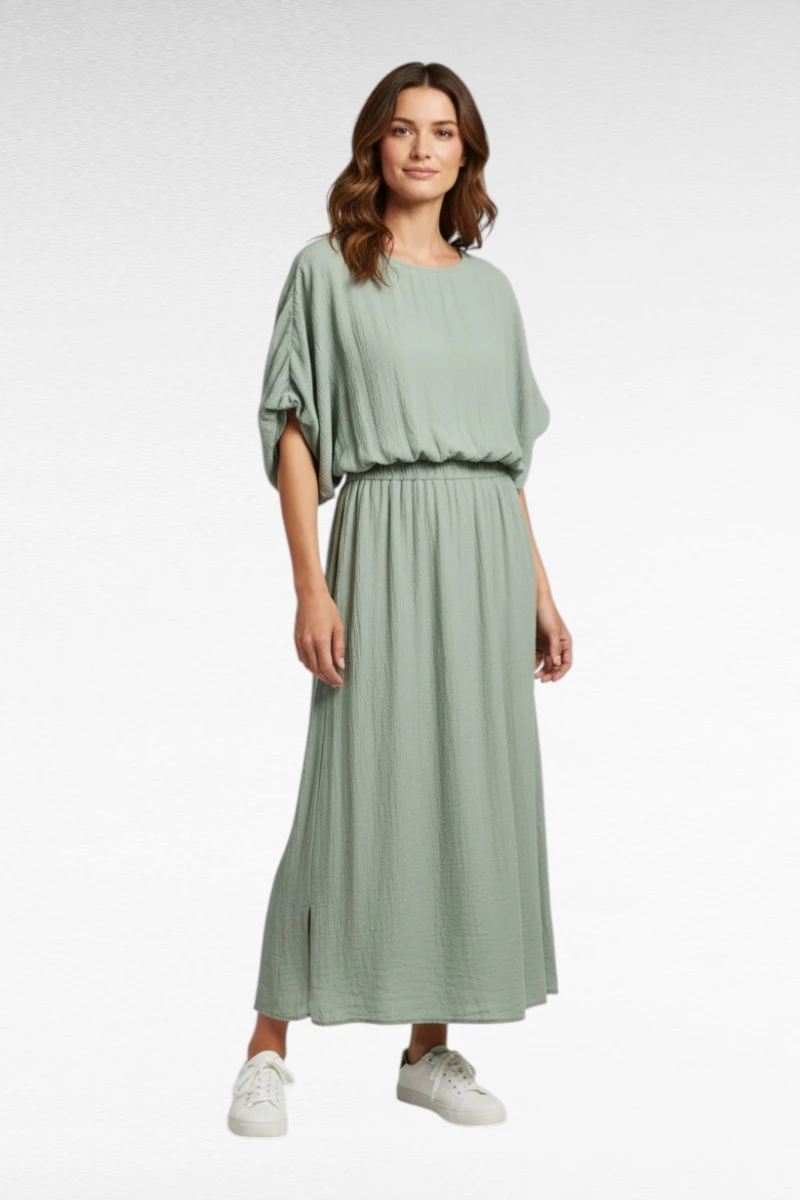 De losvallende korte mouwen en de lange rok geven de jurk een vrouwelijke en stijlvolle look. Perfect voor zowel een casual dag met sneakers als een meer geklede outfit met sandalen of hakken.