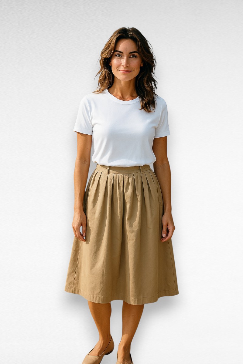 Voel je stijlvol met deze prachtige beige midi rok . Stevige katoenen kwaliteit. Perfect voor elke gelegenheid en zorgt voor een elegante uitstraling.