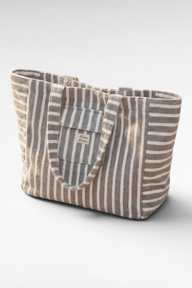 Deze stijlvolle badstof strandtas in grijs/witte strepen is een tijdloze en veelzijdige keuze voor iedere zomerse dag. De neutrale kleuren zorgen voor een rustige en moderne uitstraling, waardoor de tas moeiteloos te combineren is met al je outfits.