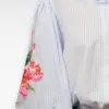 Deze lichtblauwe gestreepte blouse is een frisse en vrouwelijke toevoeging aan je garderobe. De subtiele strepen geven een tijdloze uitstraling, terwijl de geborduurde bloemen op de mouwen zorgen voor een speels en uniek detail. De blouse is gemaakt van 100% katoen, waardoor hij heerlijk luchtig en comfortabel draagt. De pofmouwen en klassieke kraag geven de blouse een elegante en moderne look. Perfect te combineren met een jeans voor een casual outfit of met een nette broek voor een meer geklede stijl.