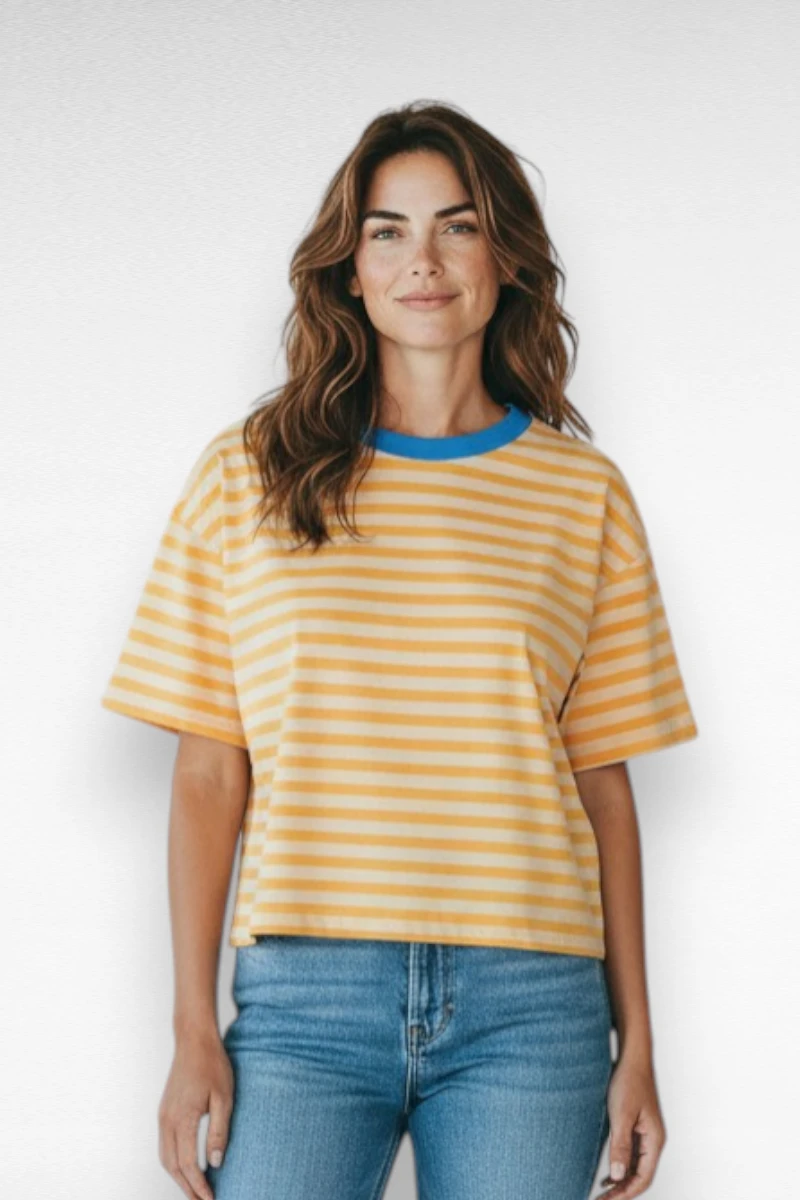 Deze frisse gestreepte top is een echte must-have voor het voorjaar en de zomer. De combinatie van zachte gele strepen met een speelse blauwe halslijn geeft de top een vrolijke en moderne uitstraling. Dankzij het kortere model is deze top perfect te combineren met een high waist jeans of rok.