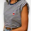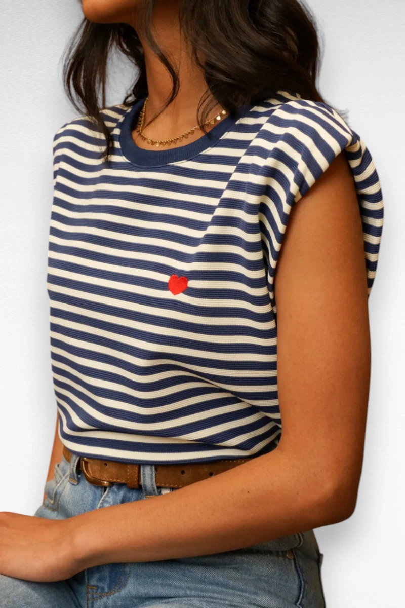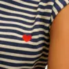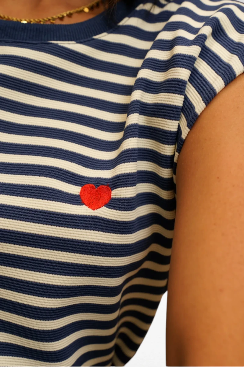 Deze blauw-wit gestreepte top is een tijdloze basic met een speelse twist. De fijne strepen geven een frisse en klassieke uitstraling, terwijl het rode hartje op de borst zorgt voor een opvallend en vrouwelijk detail. De subtiele schoudervulling geeft de top een moderne look en zorgt voor een mooie pasvorm. Dankzij de combinatie van polyester, katoen en elasthan draagt de top comfortabel en heeft hij een lichte stretch. Perfect voor zowel een casual als een iets meer geklede outfit.