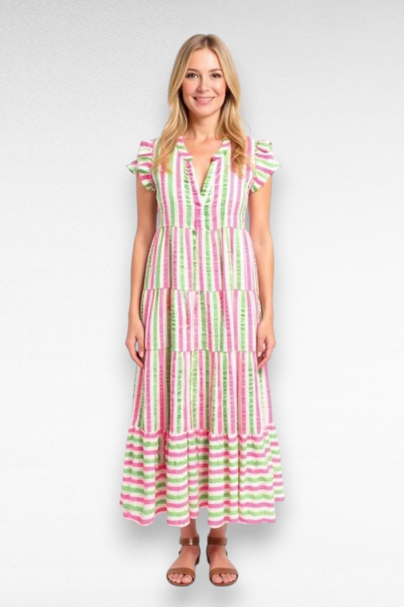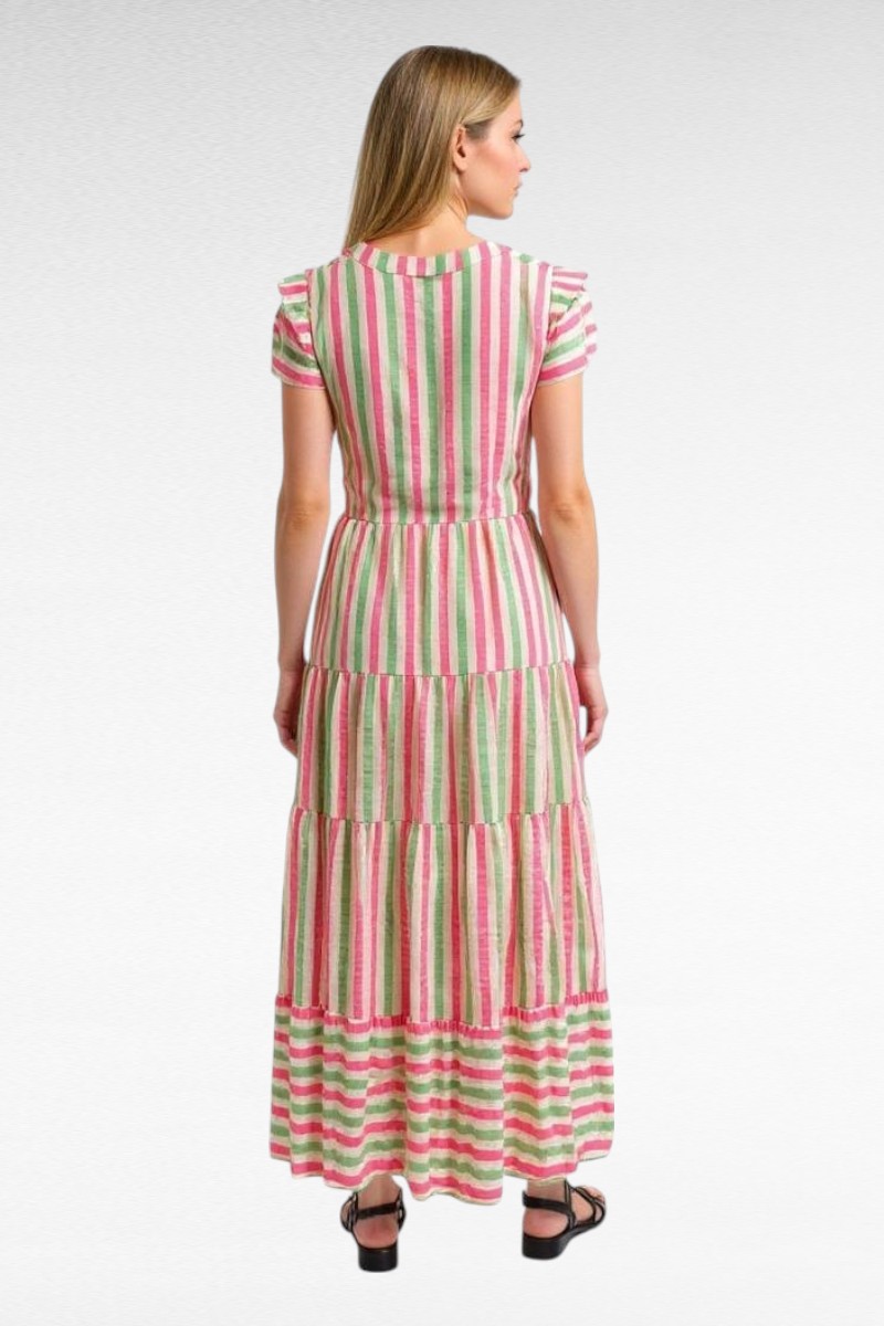 Hoe leuk is deze jurk?! 💖 Met z’n vrolijke neon roze en groene strepen, luchtige stof en zwierige pasvorm is dit jouw perfecte zomerjurk. De ruffle mouwtjes en de speelse V-hals zorgen voor een vrouwelijke en trendy look, terwijl de lengte en het model heerlijk comfortabel zitten.