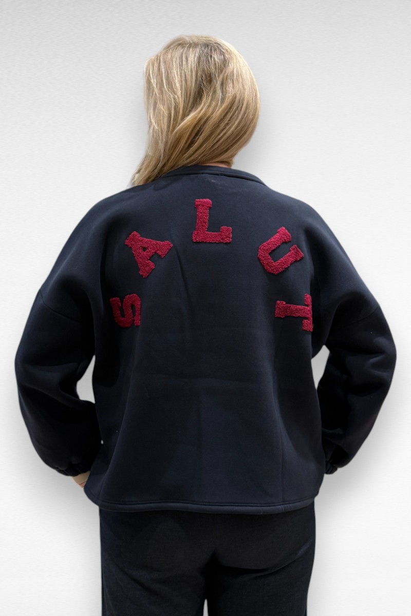 Deze donkerblauwe “SALUT” sweater is hét voorbeeld van casual met een knipoog. De trui heeft een relaxte pasvorm en voelt heerlijk zacht aan – perfect voor een chill dagje of een trendy outfit met jeans en sneakers.