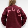 Deze bordeauxrode “SALUT” sweater met roze letters op de rug is een echte blikvanger! De warme kleur bordeaux gecombineerd met de zachte roze accenten geeft een speelse en stijlvolle uitstraling.