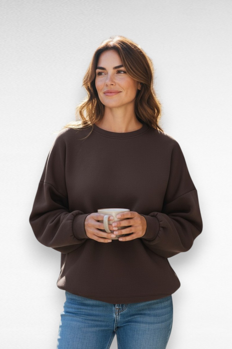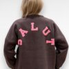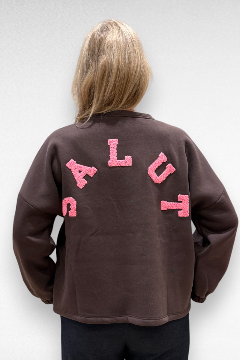 Deze donkerbruine “SALUT” sweater met roze letters op de rug is de perfecte mix van stoer en vrouwelijk. De zachte binnenkant en de losse pasvorm maken ‘m supercomfortabel — ideaal voor een relaxte dag of een casual-chique outfit.