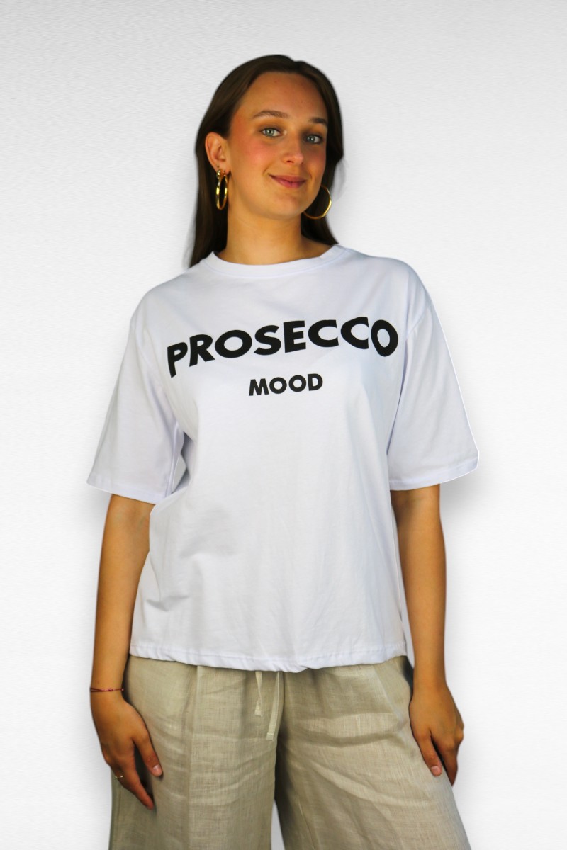 Een tof oversized wit basis t-shirt met de tekst PROSECCO MOOD. Ideaal om mee op vakantie te nemen of een heerlijk avondje op het terras. Leuk te combineren op een jeans en met een zwarte blazer . Rol de mouwtjes leuk op voor een sportief uiterlijk.