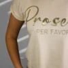 🍾✨ Cheers, maar dan in stijl! Dit beige T-shirt met de gouden tekst “Prosecco Per Favore” is dé must-have voor prosecco-liefhebbers. De aangesloten pasvorm geeft een flatterende look, terwijl de kleine omslag aan de mouwen zorgt voor een speelse touch. Gemaakt van heerlijk zacht en ademend katoen voor ultiem draagcomfort. Perfect voor een casual outfit met jeans of juist chic onder een blazer. Santé! 🥂💛