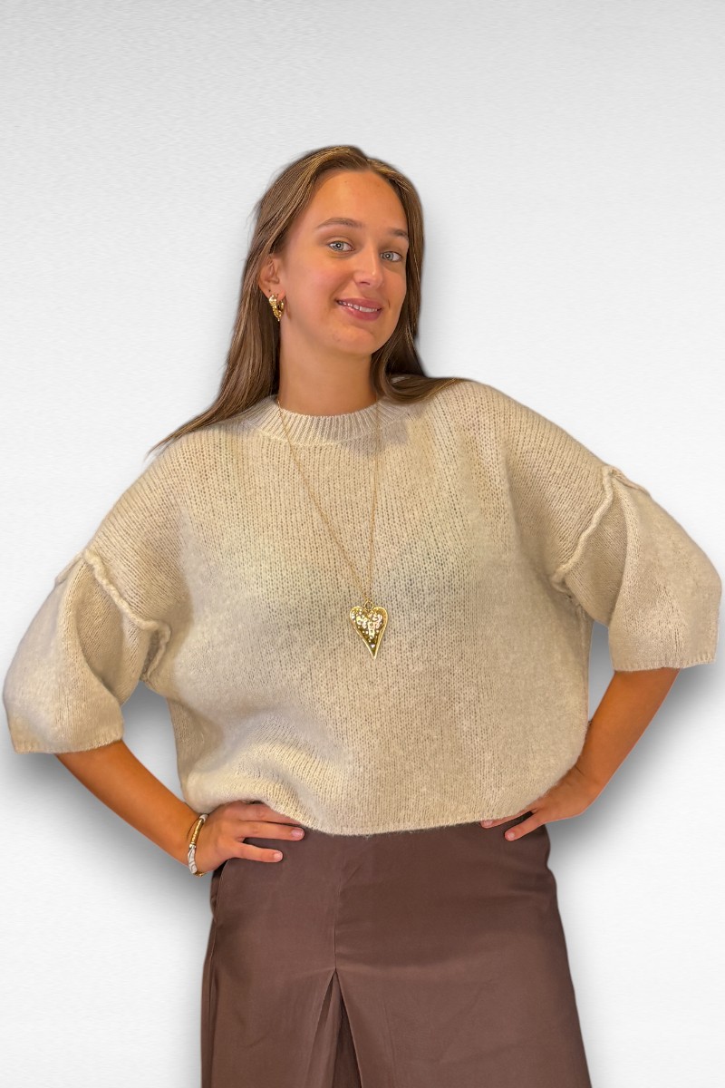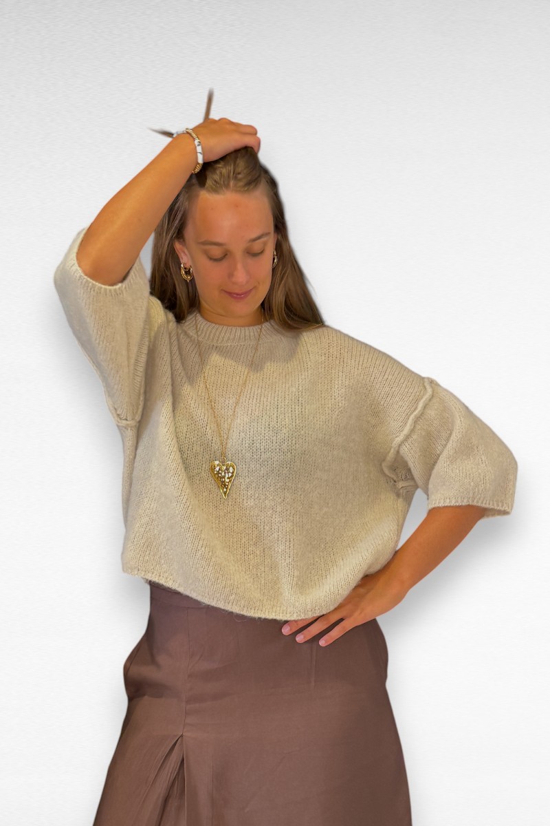 Deze beige oversized trui is echt een musthave voor je kledingkast. Met zijn relaxed fit en korte mouwen creëer je moeiteloos die effortless chic look waar iedereen naar vraagt.