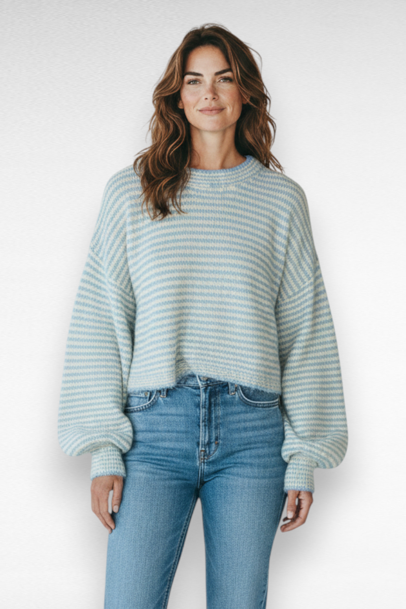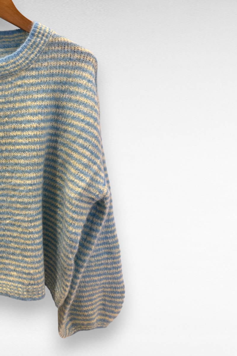 Voel je comfortabel en stijlvol in deze trui met strepen, het witte kraagje zit er aan vast. Perfect voor een casual dagje uit.