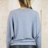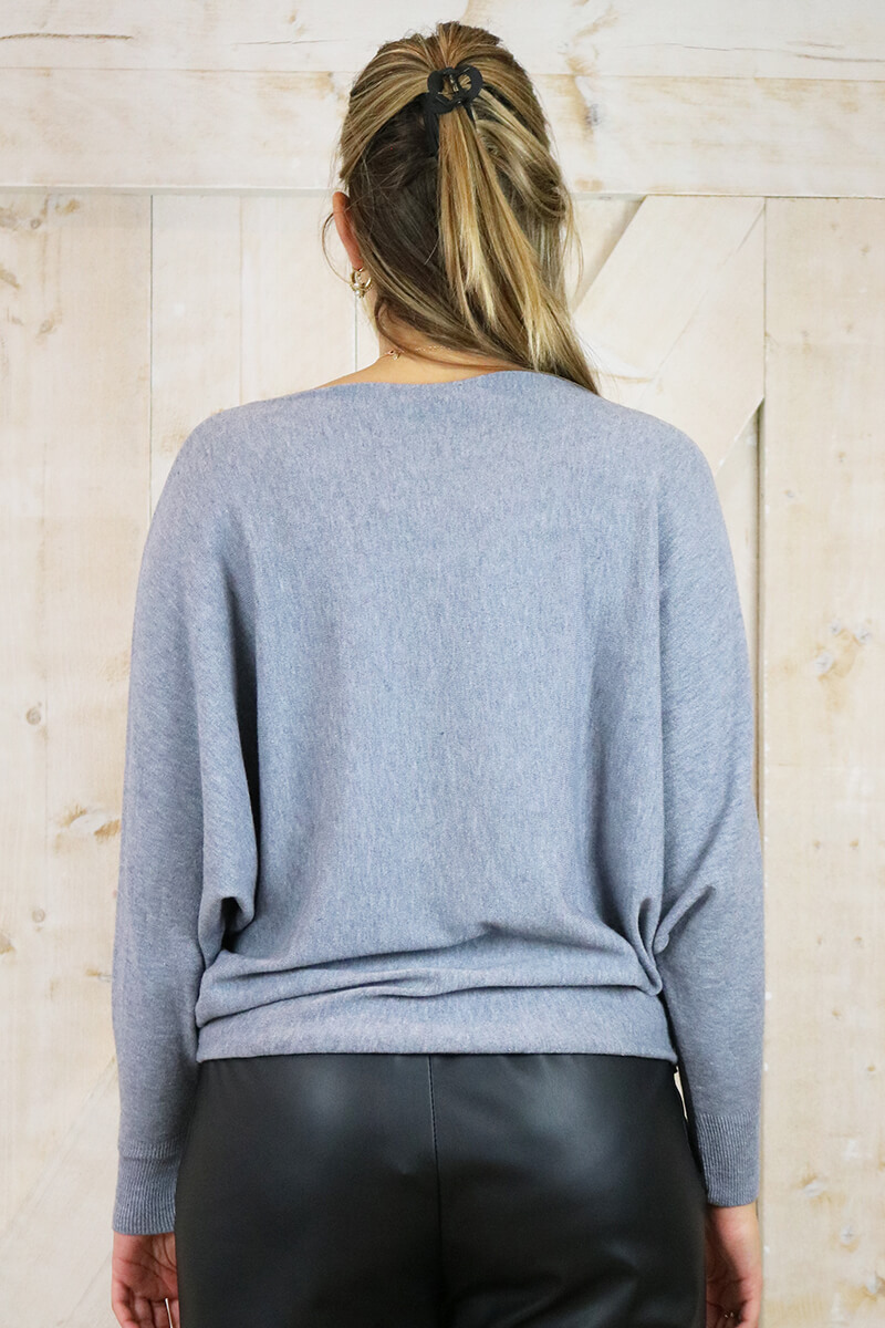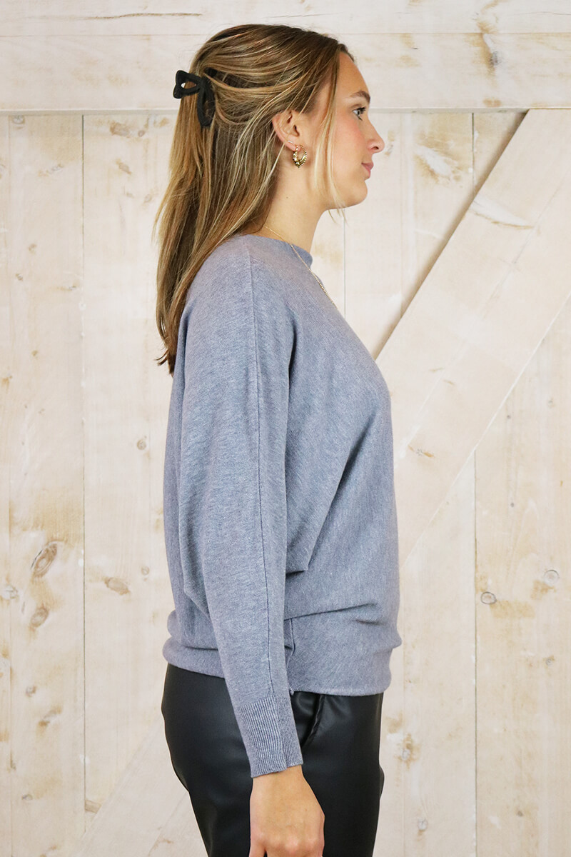 Een grijs gemêleerde dunne trui met vleermuis mouwen. Een super zachte trui met brede hals. De trui is 1 maat en valt wat aangesloten aan de onderzijde en mouwen. Ideaal met combineren met iedere outfit. ons model is 1,76m
