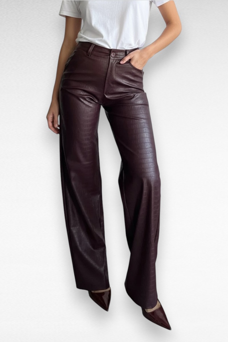 Deze donkerrode vegan leren broek met slangenprint reliëf is de perfecte combinatie van stoer en stijlvol. De subtiele glans en het verfijnde slangenpatroon geven de broek een luxe uitstraling, terwijl de rechte, losse pasvorm zorgt voor een moderne en comfortabele fit.