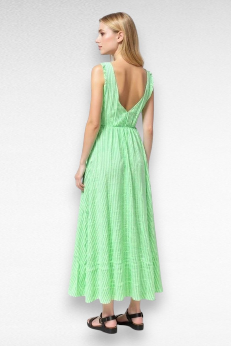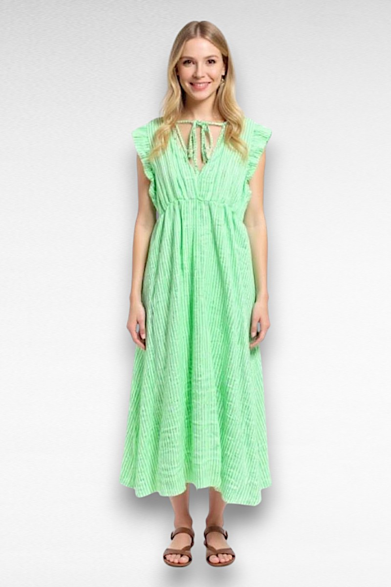 Deze groene zomerjurk is jouw nieuwe favoriet voor zonnige dagen! 💚 De frisse kleur, luchtige stof en zwierige pasvorm maken ‘m ideaal voor een dagje stad, vakantie of picknick in het park. De subtiele streepjes en het speelse strikje bij de hals zorgen voor een vrouwelijke en trendy look.