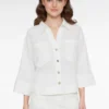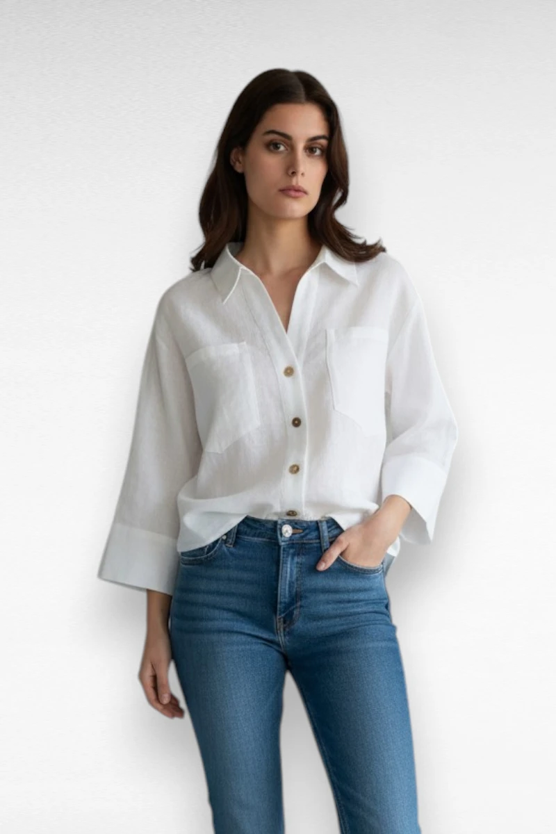 Deze stijlvolle blouse in wit is een perfecte mix van comfort en elegantie. De luchtige stof met linnen en viscose voelt heerlijk zacht aan en maakt dit item ideaal voor zowel warme dagen als een casual-chique look. De 3/4 mouwen en losse pasvorm zorgen voor een ontspannen uitstraling, terwijl de knoopsluiting en kraag een tijdloze, frisse touch geven.
