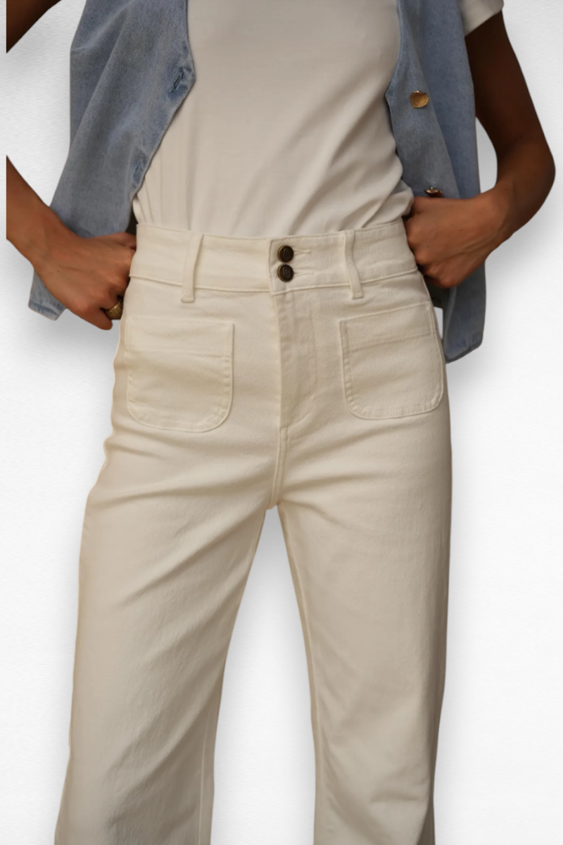 Deze off-white jeans is een stijlvolle en tijdloze toevoeging aan je garderobe. Het model heeft een high waist en wijde pijpen, wat zorgt voor een flatterende pasvorm en een moderne uitstraling. De frisse off-white kleur maakt deze jeans perfect voor zowel het voorjaar als de zomer.