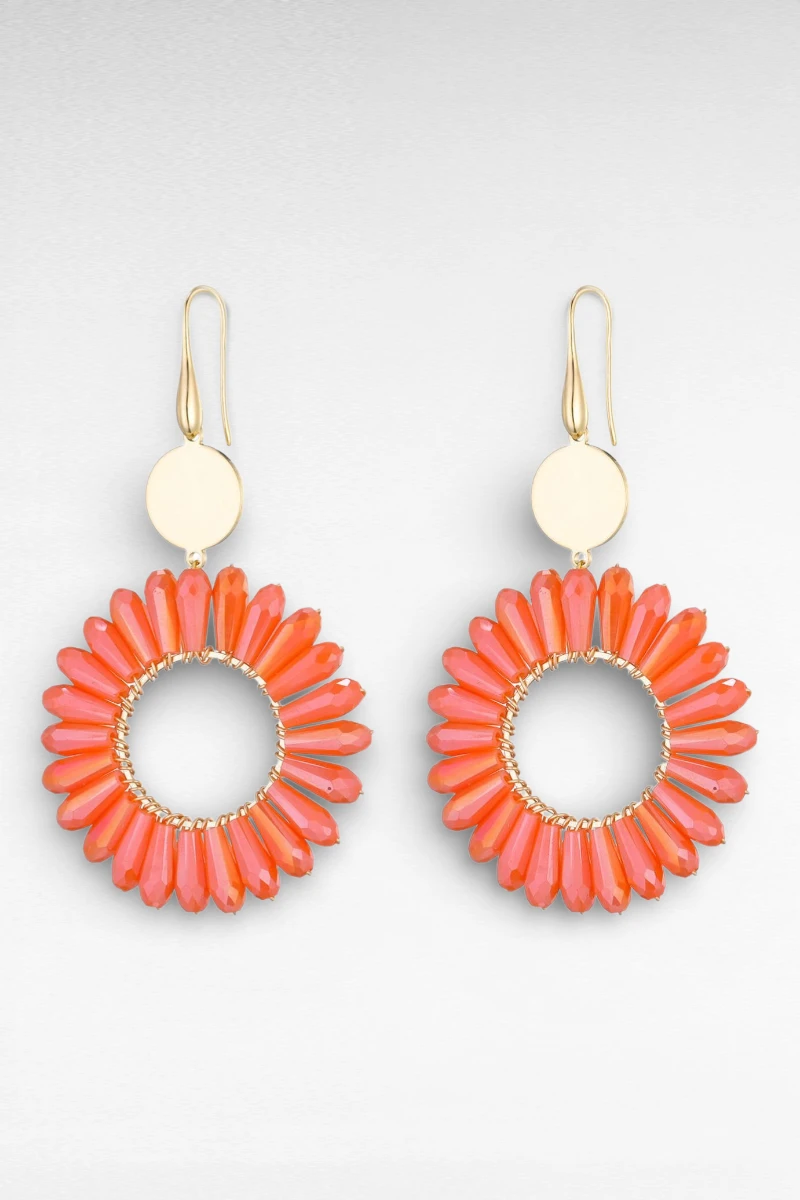 Deze opvallende oorbellen geven iedere outfit een zomerse en stijlvolle uitstraling. De oorbellen hebben een goudkleurige haaksluiting met een ronde hanger, gevolgd door een prachtige cirkelvormige hanger met koraalkleurige facet kralen die als een bloem rondom zijn geplaatst. Door het open midden en de sprankelende kralen krijgen de oorbellen een elegante en speelse look. Perfect om te dragen bij zowel een casual outfit als een feestelijke gelegenheid.