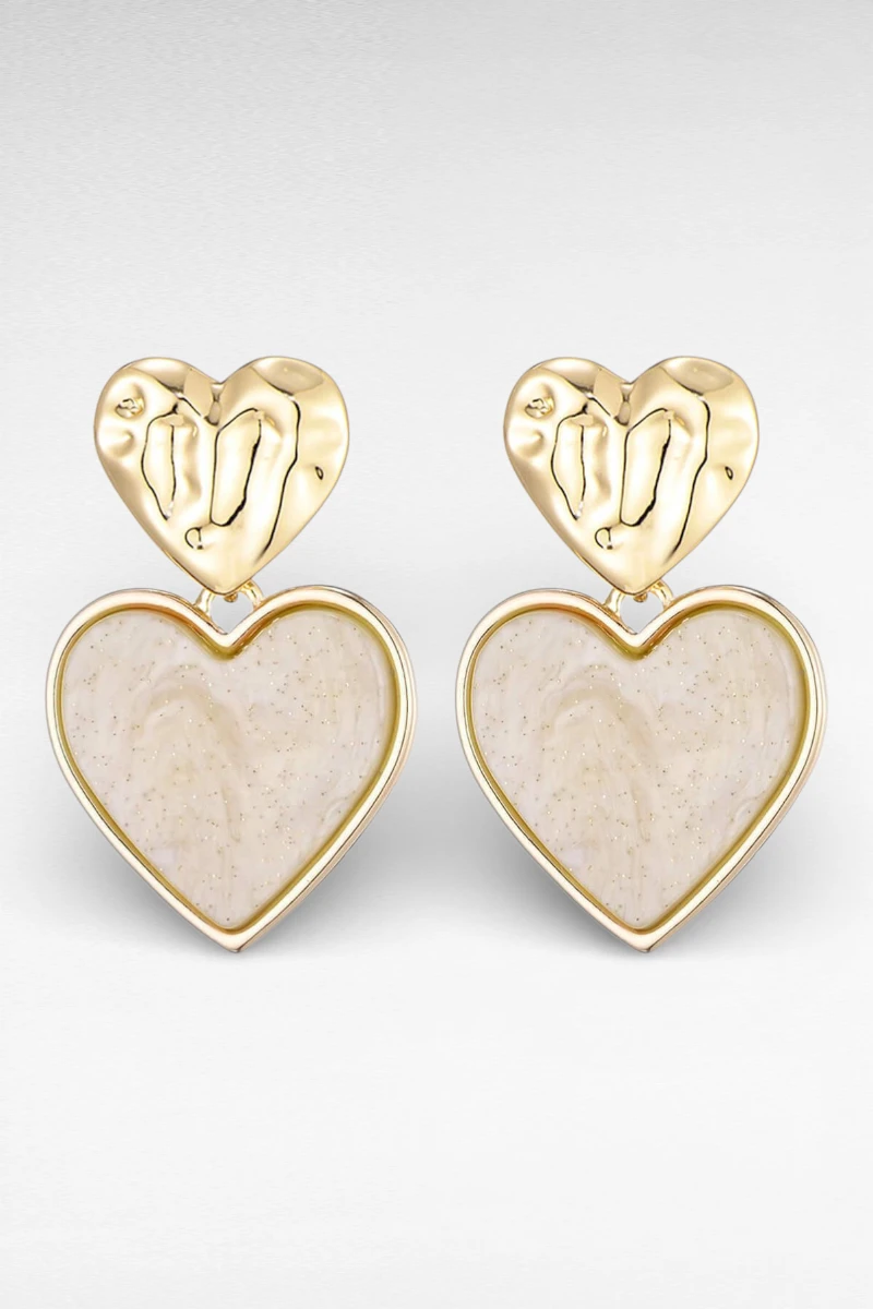 Deze stijlvolle hartvormige oorbellen geven je outfit een romantische en trendy uitstraling. De oorbellen hebben een goudkleurige hart stud met daaronder een groter hart met een mooie beige marmerlook. Door de zachte kleur en het elegante design zijn ze perfect te combineren met verschillende outfits.
