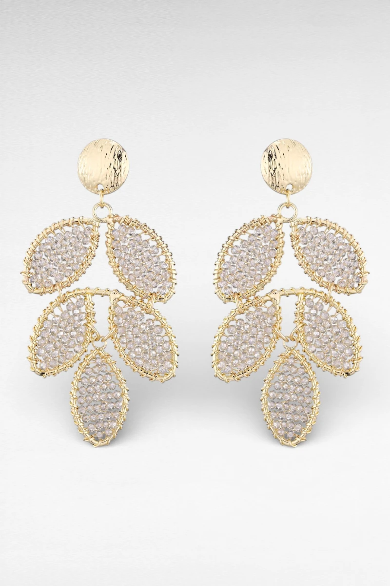 Deze elegante statement oorbellen met bladeren geven je outfit een luxe en vrouwelijke uitstraling. De oorbellen zijn opgebouwd uit meerdere blaadjes die gevuld zijn met kleine glinsterende kralen en afgewerkt met een goudkleurig frame. Hierdoor krijgen ze een subtiele sparkle die prachtig opvalt bij elke beweging.
