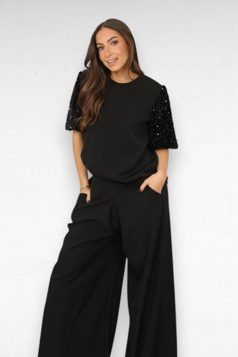 Deze zwarte sweater met glitter pofmouwen is dé perfecte mix van comfy en chic. De body is gemaakt van zacht, soepel sweatermateriaal, terwijl de mouwen volledig zijn afgewerkt met zwarte pailletten voor een feestelijke en vrouwelijke uitstraling. Een ideaal item voor dames die houden van comfortabele kleding met een luxe touch.